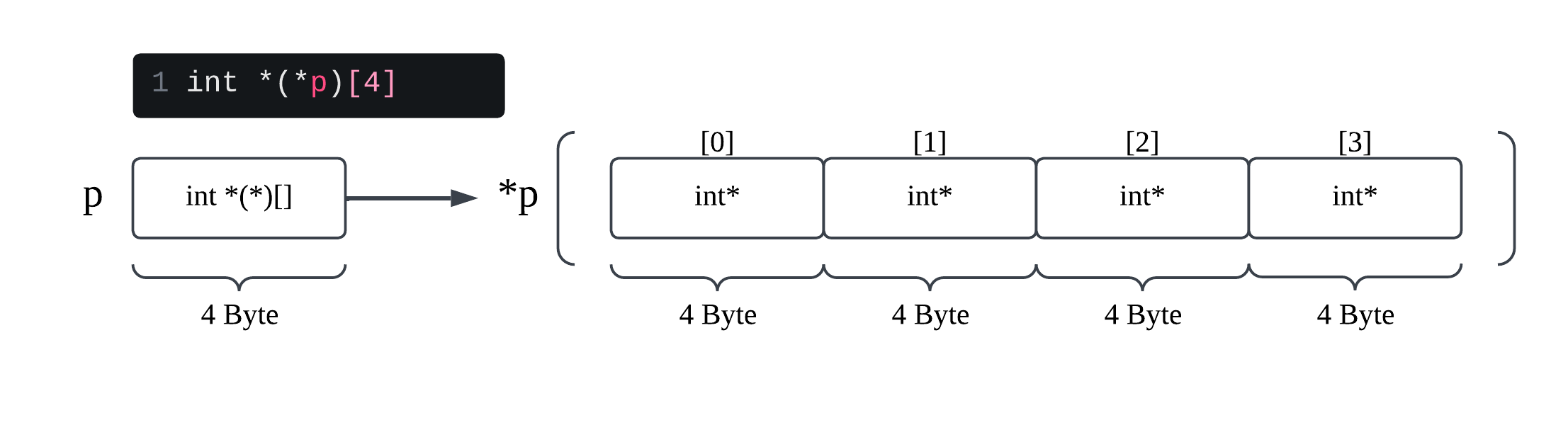 int *(*p)[4] | p | int *(*)[4] | int *[4] |